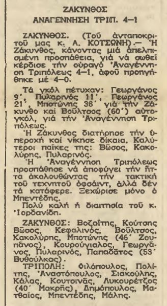Σπουδαία νίκη πέτυχε η Ζάκυνθος στο Δημοτικό Στάδιο για το πρωτάθλημα της Γ ΄ Εθνικής επί της Αναγέννησης Τριπόλεως με 4-1.Δύο γκολ έβαλε ο Γεωργάνος και από ένα οι Πυλαρινός και Μποτώνης. Προπονητής της ομάδας ήταν ο Νικ. Κεφαλληνός( ο 4ος εκείνη τη σαιζόν). Δείτε την ανταπόκριση της Αθλητικής Ηχούς.