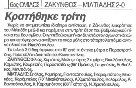 Παραμονή Αποκριάς η Ζάκυνθος για το πρωτάθλημα της Δ΄ Εθνικής νίκησε 2-0 τον Μιλτιάδη Πυργακίου με 2-0. Νικολόπουλος και Παραστατίδης ήταν οι σκόρερς της ομάδος μας που είχε προπονητή τον Α. Παπαγεωργίου. Δείτε το δημοσίευμα της Α.Η.