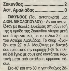 Με γκολ των Αν. Μουζάκη και Κοντονή η Ζάκυνθος νίκησε στο Στάδιο τον Αστέρα Αμαλιάδας με 2-0 για το πρωτάθλημα της Δ΄ Εθνικής. Ήταν όαση η νίκη αυτή μπροστά στα τραγικά αποτελέσματα που είχε η ομάδα μας εκείνη την χρονιά.