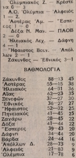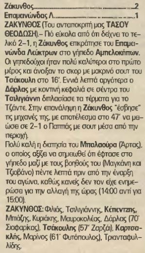 Για το πρωτάθλημα της Δ΄ Εθνικής η Ζάκυνθος νίκησε τον Επαμεινώνδα Λεύκτρων με 2-1. Σκόραραν από το α΄ ημίχρονο οι Τσάκουλης στο 16΄ και Δάρλας στο 25΄. Μείωσε ο Παππάς στο 47΄.