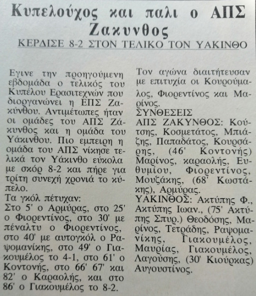 Στον 3ο τελικό Κυπέλλου ΕΠΣ Ζακύνθου που διεξήχθη στο Δημοτικό Στάδιο Ζακύνθου, η Ζάκυνθος νίκησε τον Υάκινθο με 8-2 και κατέκτησε το τρόπαιο.. Τρία γκολ έβαλε ο Καραολής, δύο ο Φιορεντίνος και από ένα οι Αρμύρας, Κοντονής, Ραψομανίκης (αυτογκόλ) ,ενώ του Υάκινθου ο Γιακουμέλος (2).