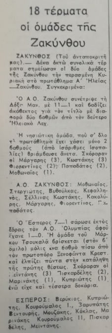Το τρίτο μεγαλύτερο σκορ της ιστορίας της πέτυχε η Ζάκυνθος (τα δύο πρώτα είναι 15-1 τον Αστέρα Μαχαιράδου και 12-0 τον Ολυμπιακό Σαβαλίων ) συντρίβοντας την Δόξα Μανωλάδος με 11-1 για το πρωτάθλημα της Α΄ ΕΠΣ Ηλείας -Ζακύνθου. Μέχρι και ο τερματοφύλακας Μοθωναίος σκόραρε. Τα άλλα πέτυχαν οι Μάργαρης και Κωστάκης από τρία και Φιορεντίνος- Παπαδάτος από δύο.