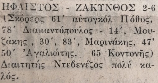 Για το πρωτάθλημα της Α΄ ΕΠΣ Ηλείας -Ζακύνθου η Ζάκυνθος συνέτριψε στον Πύργο τον Ήφαιστο Βουνάργου με 2-6. Σκόραραν για την ομάδα μας οι Μουζάκης (2) , Μαρινάκης ,Αγαλιώτης και Κοντονής.