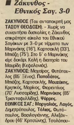 Για το πρωτάθλημα της Δ΄ Εθνικής η Ζάκυνθος νίκησε τον Εθνικό Σαγέϊκων με 3-0. Σκόραραν οι Μαρινάκης ,Καρτσακλής και Μπιάζης. Δείτε το δημοσίευμα από την ” Α.Η”.