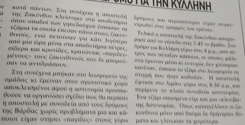 Η νίκη της Βάρδας επί της Ζακύνθου με 1-0 (Καρβελούτσος 31΄) πέρασε σε δεύτερη μοίρα μπροστά στα αντίποινα των γηπεδούχων , σε επαγγελματικό αγώνα Γ΄ Εθνικής, για τα επεισόδια του α΄γύρου. Οι ΄”καλοί” φίλοι της Βάρδας περίμεναν να τελειώσει το ματς (για να μην διακοπεί εις βάρος τους )και μετά έδρασαν. Πραγματικά κινδύνευσαν ζωές .