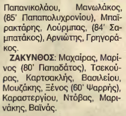 ΖΑΚΥΝΘΟΣ(Τ.Παλατσίδης): Αποστόλου, Λιβέρης, Μαρίνος (67΄ Μιχαήλ), Βυθούλκας Π., Κάρδαρης Κ. (79΄ Κάρδαρης Θ.), Μαζουρκίεβιτς (71΄ Γαλανός), Ναγιέφσκι, Κατσικάρης, Πεχλιβανίδης, Γεωργίου, Κωστάκης.
