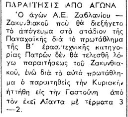 ΄Εχοντας εξασφαλίσει την παραμονή του στην Β΄ ΕΠΣ Πατρών, ο Ζακυνθιακός δεν πήγε στην Πάτρα ( Τετάρτη ) να παίξει με το Ζαβλάνι και έχασε στα χαρτιά 2-0 ά.α.