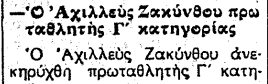 Σε ένα παιχνίδι ΜΙΑ ΚΑΤΗΓΟΡΙΑ ο Ακαρνάν νίκησε για το πρωτάθλημα της Γ΄ ΕΠΣ Πατρών τον Αχιλλέα στο Αγρίνιο με 1-0. Χάρηκαν όμως ΠΡΟΣΩΡΙΝΑ οι γηπεδούχοι την κατάκτηση του τίτλου, αφού κάποιος Ζακυνθινός που ζούσε στο Αγρίνιο αναγνώρισε ότι ο Ακαρνάν για να νικήσει το ματς “δανείστηκε” και χρησιμοποίησε δύο παίκτες από τον Παναιτωλικό….Έτσι έγινε η ένσταση- πλαστοπροσωπίας και μετά από 35 μέρες ο Αχιλλεύς την κέρδισε μαζί και το πρώτο πρωτάθλημα της ιστορίας του , στην πρώτη επίσημη συμμετοχή Ζακυνθινής ομάδας σε Πανελλήνιο πρωτάθλημα.