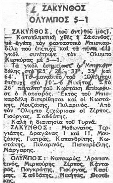 ΕΠΟΧΗ ΕΘΝΙΚΟΥ ΑΣΤΕΡΑ. Παίζοντας εκπληκτικό ποδόσφαιρο η Ζάκυνθος συνέτριψε τον Όλυμπο Κερκύρας με 5-1 για τα πλέι-οφ ανόδου στην Β΄ Εθνική . Και τα πέντε γκολ πέτυχε ο Πισκαρδέλης!!!