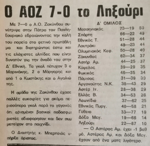 Στην Πάτρα (τιμωρημένη η έδρα) η Ζάκυνθος συνέτριψε το Ληξούρι με 7-0 για το πρωτάθλημα της Δ΄ Εθνικής αλλά ήταν δύσκολη η είσοδος στην πρώτη πεντάδα της βαθμολογίας που παρέμενε στην κατηγορία. Τρία γκολ έβαλε ο Μαρινάκης ,δύο ο Μάργαρης και από ένα οι Κωστάκης- Αγαλιώτης.