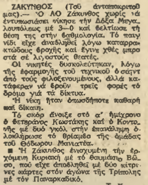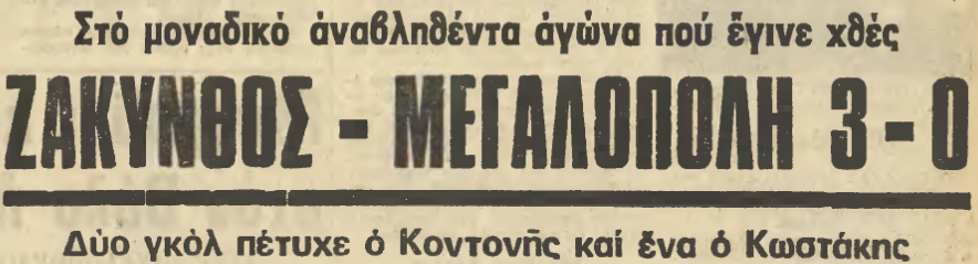 Για το πρωτάθλημα της Δ΄ Εθνικής η Ζάκυνθος νίκησε στο Στάδιο την Δόξα Μεγαλόπολης με 3-0 (2-0) σε αγώνα που είχε αναβληθεί την προηγούμενη μέρα λόγω κακών καιρικών συνθήκων. Δύο γκολ έβαλε ο μόνιμος σκόρερ ( εναντίον της Δόξας Μεγαλόπολης ) Κοντονής και το άλλο ο Κωστάκης.