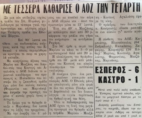 Για το πρωτάθλημα της Α΄ κατηγορίας ΕΠΣ Ηλείας -Ζακύνθου η Ζάκυνθος συνέτριψε στο Στάδιο τον αήττητο μέχρι εκείνη την αγωνιστική Εθνικό Πύργου με 4-0. Σκόραραν οι Μαρινάκης, Μουζάκης Μαρίνος και Κοντονής .
