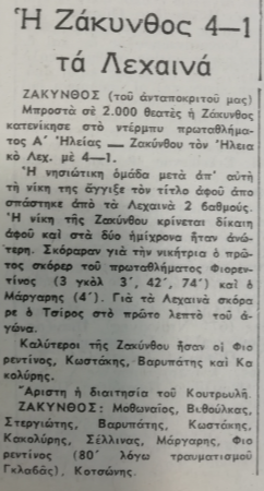Στο 4΄ (!!!)η Ζάκυνθος κέρδιζε 2-1 (είχαν μπει με την έναρξη 3 γκολ!!!) τον Ηλειακό Λεχαινών για το πρωτάθλημα της Α΄ Ηλείας -Ζακύνθου και τελικά νίκησε 4-1 με χατ-τρικ του Φιορεντίνου (3΄, 42΄,74΄) και Μάργαρη (4΄).